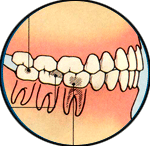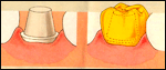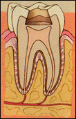 A crown is cover for a tooth that’s been weakened by decay (right) or by recurrent fillings. A crown may also be required after a root canal or when a tooth has broken or cracked. The most common material used include gold, porcelain, and metal alloys.